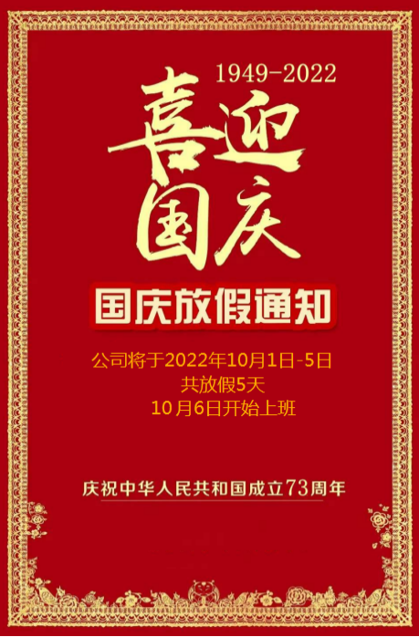 尊敬的廣大客戶: 您們好!2022國慶將至,我司國慶節(jié)放假安排如下:2022年10月1日—5日放假,共計5天!10月6日(星期四)開始上班,不便之處敬請諒解!? 大家節(jié)日快樂,生意興??!2022-09-28查看詳情 -