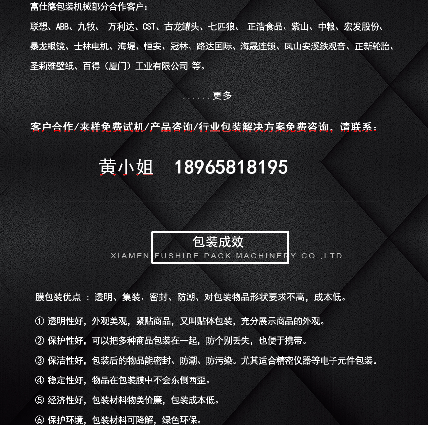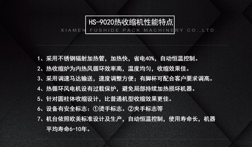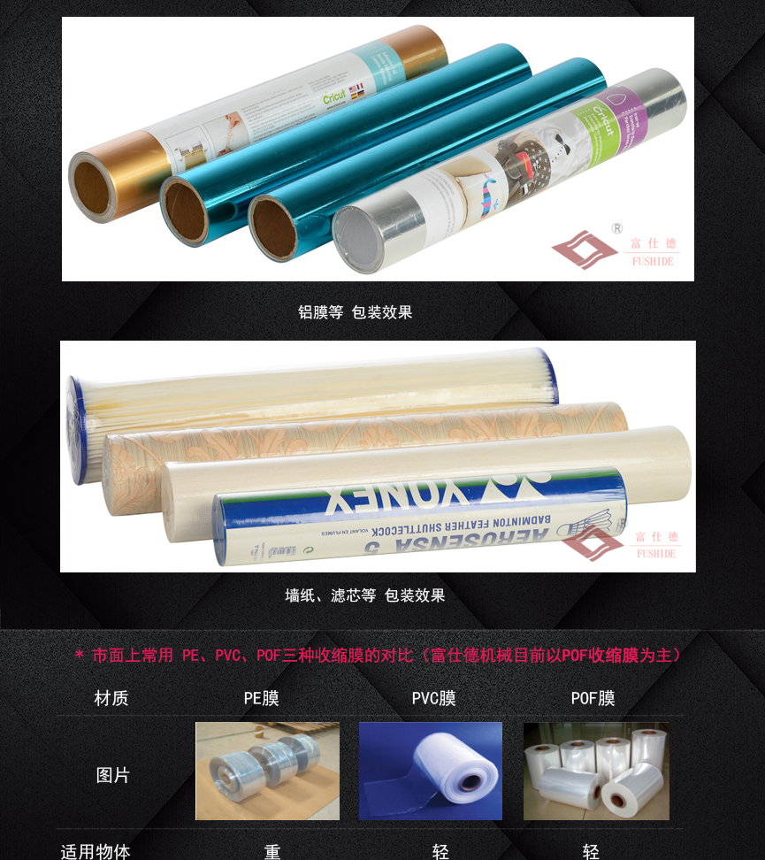 收縮過程中,不影響包裝物的品質(zhì),而能收縮快速完美,包裝后的產(chǎn)品能密封、防潮、防撞擊、適用于多件物品緊包裝和托盤包裝。