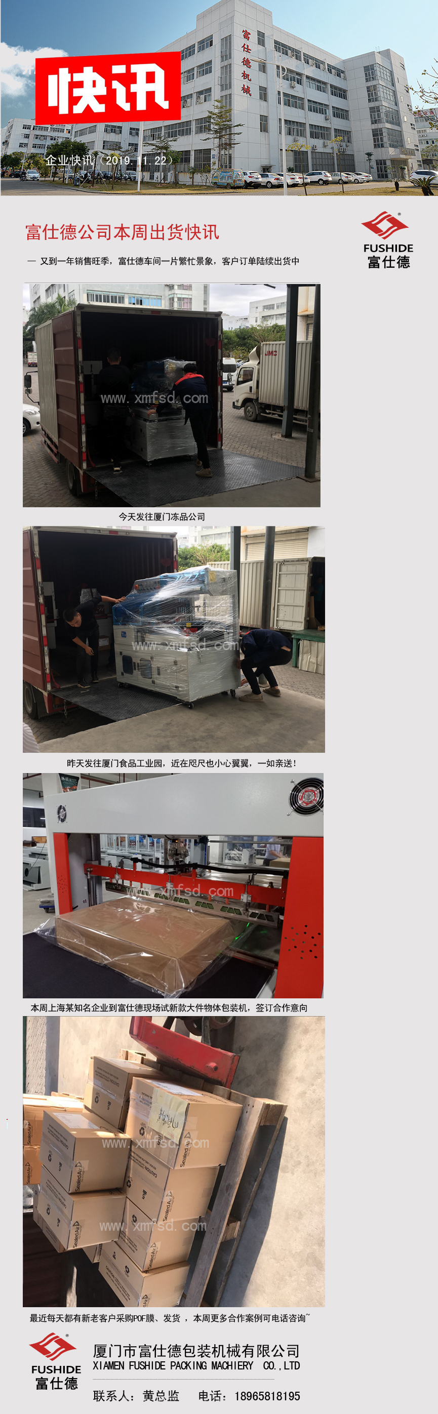 富仕德公司本周出貨快訊: - 又到一年熱收縮膜包裝機(jī)、熱收縮機(jī)、POF熱收縮膜銷售旺季,富仕德車間一片繁忙景象,客戶訂單陸續(xù)出貨中!